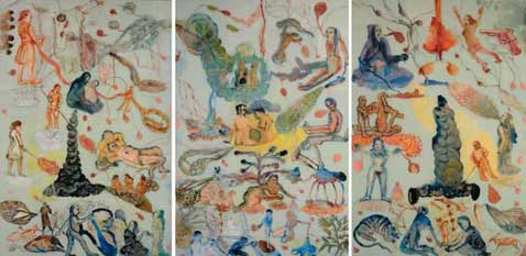 Among the references to antiquity that can be found in Malani’s current painting (as throughout Indian culture) is her recollection of a standard neolithic icon in Medea I (2006). A mother goddess with an emphasized vagina is presented as the central axis of the pictorial field, surrounded by figures emanating from her. The series “Stories Retold: Mappings” (2007-08) shows another aspect of this female force. Its ten panels are connected by a kind of umbilical or intestinal interlacing that signifies energy or life force traveling through a cosmic female circuit. Splitting the Other (2008) also involves a unifying umbilical/intestinal element. In Medea III (2006), female icons from the Venus of Willendorf to modern pop idols occupy a world unified by Benday dots. Appeasing Radha (2006) is a triptych in which a goddess form that looks like it has been modeled of mud or dark gray clay is depicted in each of the flanking panels, amid a welter of flying figures. In the central panel, a physical or spiritual communion is illustrated.